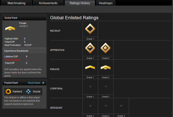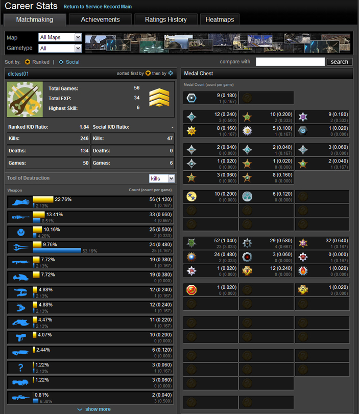 Players will notice that their Career Stats page has seen a pretty significant visual facelift. We've brought Ranked and Social stats onto the same page and allowed players to sort which stat they'd like to see first. The Gold Bars represent Ranked stats and the Purpley-blue (I'm colorblind) colored bars represent Social stats. Regardless of which preference you're sorting by (Ranked on top, or Social on top), your medal chest sorting will mirror that preference.