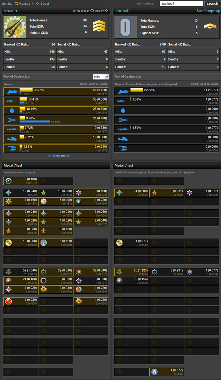 The second reason we wanted to get all of the stats onto a single page was for a new feature the Bungie.net team implemented: Player Comparisons. As the name suggests, this allows you to enter another player's gamertag into the window and we'll spit out a side by side comparison of the two players using the new stats view.