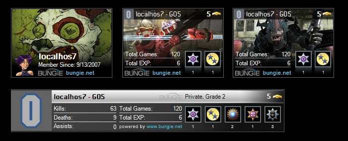 The "Bungie Card" is a cool way to take your Halo 3 stats and information with you anywhere you go on the interwebs. These banners can be displayed on your personal blog, website or favorite forums. These cards are not static - they are updating regularly in real-time to keep your latest Halo 3 stats on display.