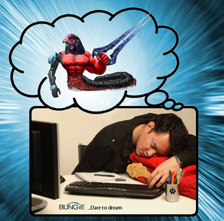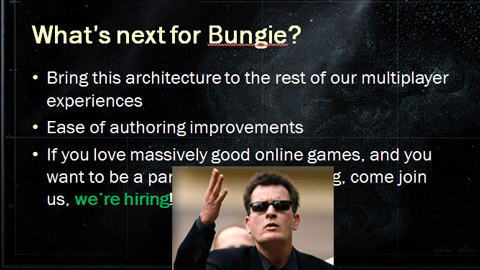The Slide Heard Round the WorldTired of pretending that he's not a -blam!-in' rock star from Mars, David Aldridge inhaled a huge hit of David Aldridge at GDC yesterday. Subsequently, his face melted off and children wept over his exploded body. After the childish tears, gelatinous gibs, and acrid smoke cleared, an industrious journalist noticed the final slide from David's GDC deck which apparently proclaimed that we were hiring for a "massively…multiplayer action game." Ruh oh. Now, in rehearsal Aldridge was convinced that everybody got the joke. It was all in the delivery, he assured us, and he was certain it was clear that he was playfully riffing off of the recent rumors. Unfortunately, most people can't figure David out – they can't process him. And we don't expect them to. You can't process David Aldridge with a normal brain. You'd need tiger blood and Adonis DNA. ![]()