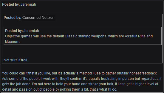 Bungie Weekly Update: 04/29/2011Posted by urk at 4/29/2011 2:29 PM PDTIf you haven't noticed, week over week we've been slowly, but surely conditioning your mind to subsist on fewer and fewer nourishing updates. My bad. It's for your own good, though. During the last decade, we've all put on a thick, silky layer of fat by sucking back a steady diet of rich and creamy content straight from the Bungie.net teat. But as we rapidly approach our upcoming transition away from supporting Halo – which we will describe in explicit detail very, very soon – we want you to be prepared for what could be a fairly radical paradigm shift. Some of my colleagues have proposed that I utilize the tried and true "Band-Aid" method, ripping you away from our lovingly hairy embrace in one swift and terrible motion. I worry that this Friday custom has become too permanent a part of your weekly regiment, and I definitely don't want to leave an angry red bald spot on your heart. I simply couldn't live with myself. So, there's just a little bit of light reading this week – a few, tasty morsels to keep you from starvation. But just remember, it's all for the best. It's all for you. And it'll all make way more sense soon. Meat JohnSeveral months back we added John Hopson to our team, tasking him with heading up our shiny new internal User Research division. You might have already answered some survey questions for him as part of our Bungie Beta Testers program, and if you cast your mind back to the run up to Halo 3 and the Wired article, Halo 3: How Microsoft Labs Invented a New Science of Play, you probably already have a very basic understanding of what Hopson does on a day-to-day basis. He's basically our own personal, post-resurrection Neo (minus the trench coat, shades, and dated mobile phone) swimming through our very real matrix of player data to arm our team with the revolutionary information that they need to build better games. Whoa. Of course, presented with the opportunity to harness the power offered up by billions of points of player data, I've decided to steer Hopson towards more pressing, personal matters of my own. The response I've quoted below, from Hopson himself, might be a little bit odd without the proper context. Unfortunately, the query I sent him is Top Secret and it has to remain classified for a few more weeks. However, his answer is meaty enough that I think you should have a look at it. Today's update may be light fare, but there just might be a smorgasbord of sizzling, bacon-wrapped celebration looming on the horizon. "Average length of a game in the Team Slayer hopper is 8 minutes. ![]() If we round that up to 10 minutes to account for postgame time and matchmaking time, that's 144 games in a 24 hour period for one team. The average cow yields about 84 lbs. of steak, assuming 8 oz. steaks...we'll need 1.7 cows. This is the best data request ever. John" You think that's air you're breathing? Stay tuned. Game, Set, MatchmakingOn the subject of mind-bending alternate realities, Optimatch – our forum for matchmaking feedback – is always bristling with barbed questions, stinging accusations, and indignant inquiries aimed at figuring out our approach to matchmaking hopper settings, but none are as probing as those that attempt to peer into our frightening Fungineer's bitter and callous soul. Assessing a man's motives is a complex proposition. Many eminent science-type dudes and ladies have proposed countless methods to get the job done. But assessing Jeremiah's motives is like venturing through the House of Leaves where each new twist and turn leads you further into the inky black, and where each new door opens a gateway that leads not to escape or understanding, but further and deeper into madness. ![]() Even Alder would have refused to plumb these depths. Behold! ![]() The man is toying with you, feigning affection and using illegitimate facts to extract information from you. I stopped by his desk yesterday to figure out why he was employing mind tricks on our beloved community, and as he began to rattle off a reasonable sounding explanation I felt a warm, calming sensation begin to wash over me. Then a wry smile began to form across his face, and I knew that I too was merely a pawn in his dastardly psychological machinations. Later in the day, he returned to taunt me with another "sweet idea he had for matchmaking," but I refused to listen to his sweet nothings. It was all likely just another ploy intended to elicit an emotional response that he can chart inside of his grand matchmaking experiment. No dice, Jeremiah. Get behind me! Besides, your idea totally sucked. Friends, I wanted to tell you that Objective game variants in Team Classic would feature DMR starts, not Assault Rifles, as Jeremiah had loudly proclaimed last week. I wanted to ease your short range pain and suffering, turning thoughts of spraying and praying toward dreams of long range, cross-map donging. Now I don't know what to believe. I don't even know what's real. Come early May, anything is possible. Breaking News! And apparently "anything" Includes "Super Jackpots." But you won't have to wait until next week to see if this is just another one of Jeremiah's devilish promises. You can go get yourself a heaping helping of extra credits right now.