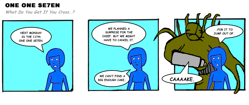 On April 30, 2003, Stuntmutt began turning in episodes of a new comic known as One One Se7en. We'll present them here, in the order in which they were submitted, as they come in. New submissions were added Monday, Wednesday, and Friday. On March 3, 2008, One One Se7en was retired from regular releases - Stunt's life got a tad too busy for 3 strips per week. (He still comes by with new content when the situation arises, however.)