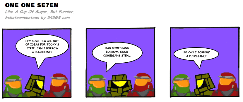 On April 30, 2003, Stuntmutt began turning in episodes of a new comic known as One One Se7en. We'll present them here, in the order in which they were submitted, as they come in. New submissions were added Monday, Wednesday, and Friday. On March 3, 2008, One One Se7en was retired from regular releases - Stunt's life got a tad too busy for 3 strips per week. (He still comes by with new content when the situation arises, however.)
