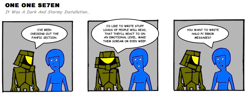 On April 30, 2003, Stuntmutt began turning in episodes of a new comic known as One One Se7en. We'll present them here, in the order in which they were submitted, as they come in. New submissions were added Monday, Wednesday, and Friday. On March 3, 2008, One One Se7en was retired from regular releases - Stunt's life got a tad too busy for 3 strips per week. (He still comes by with new content when the situation arises, however.)