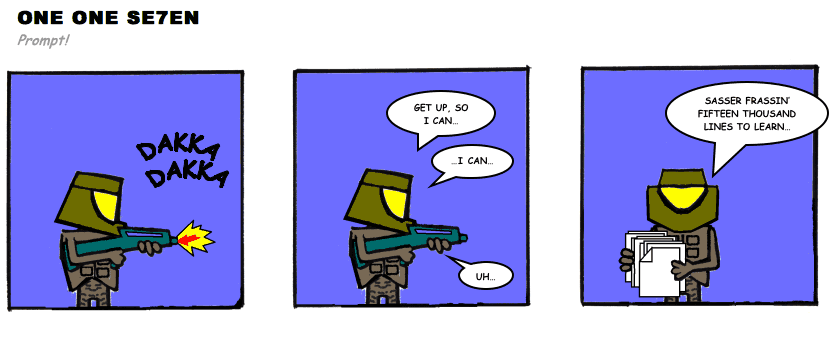 On April 30, 2003, Stuntmutt began turning in episodes of a new comic known as One One Se7en. We'll present them here, in the order in which they were submitted, as they come in. New submissions were added Monday, Wednesday, and Friday. On March 3, 2008, One One Se7en was retired from regular releases - Stunt's life got a tad too busy for 3 strips per week. (He still comes by with new content when the situation arises, however.)