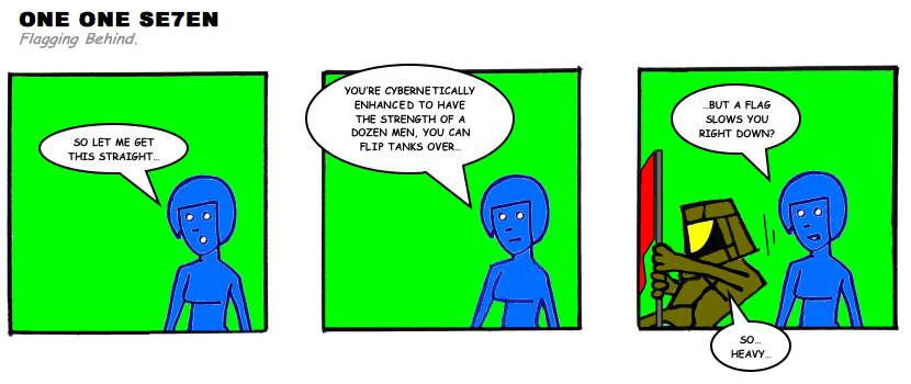 On April 30, 2003, Stuntmutt began turning in episodes of a new comic known as One One Se7en. We'll present them here, in the order in which they were submitted, as they come in. New submissions were added Monday, Wednesday, and Friday. On March 3, 2008, One One Se7en was retired from regular releases - Stunt's life got a tad too busy for 3 strips per week. (He still comes by with new content when the situation arises, however.)