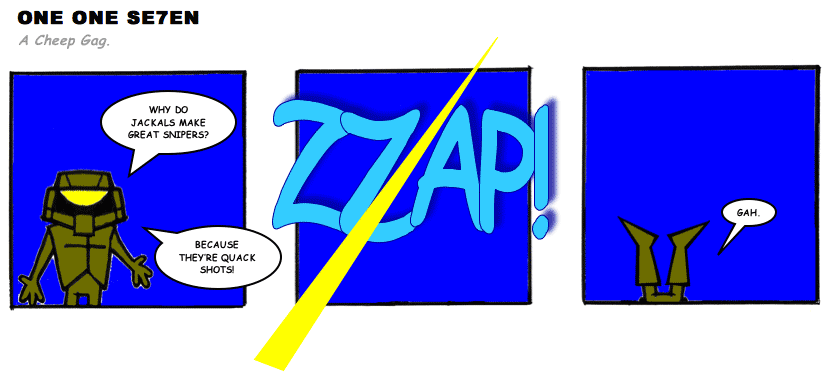 On April 30, 2003, Stuntmutt began turning in episodes of a new comic known as One One Se7en. We'll present them here, in the order in which they were submitted, as they come in. New submissions were added Monday, Wednesday, and Friday. On March 3, 2008, One One Se7en was retired from regular releases - Stunt's life got a tad too busy for 3 strips per week. (He still comes by with new content when the situation arises, however.)