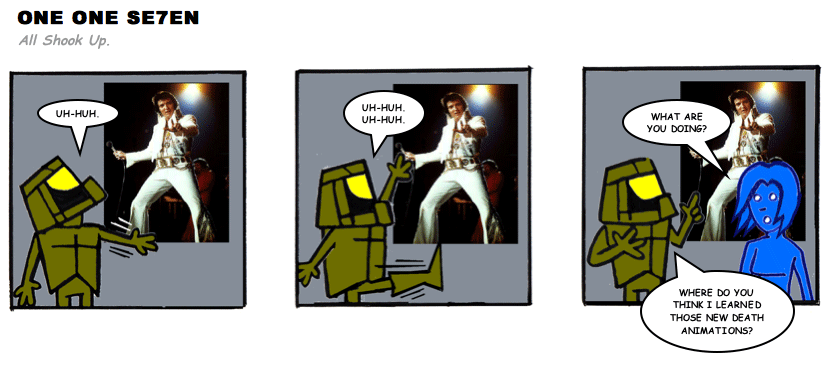 On April 30, 2003, Stuntmutt began turning in episodes of a new comic known as One One Se7en. We'll present them here, in the order in which they were submitted, as they come in. New submissions were added Monday, Wednesday, and Friday. On March 3, 2008, One One Se7en was retired from regular releases - Stunt's life got a tad too busy for 3 strips per week. (He still comes by with new content when the situation arises, however.)