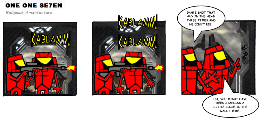 On April 30, 2003, Stuntmutt began turning in episodes of a new comic known as One One Se7en. We'll present them here, in the order in which they were submitted, as they come in. New submissions were added Monday, Wednesday, and Friday. On March 3, 2008, One One Se7en was retired from regular releases - Stunt's life got a tad too busy for 3 strips per week. (He still comes by with new content when the situation arises, however.)
