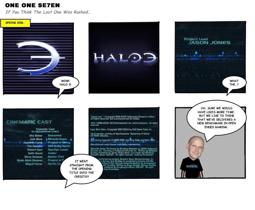 On April 30, 2003, Stuntmutt began turning in episodes of a new comic known as One One Se7en. We'll present them here, in the order in which they were submitted, as they come in. New submissions were added Monday, Wednesday, and Friday. On March 3, 2008, One One Se7en was retired from regular releases - Stunt's life got a tad too busy for 3 strips per week. (He still comes by with new content when the situation arises, however.)