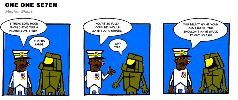 On April 30, 2003, Stuntmutt began turning in episodes of a new comic known as One One Se7en. We'll present them here, in the order in which they were submitted, as they come in. New submissions were added Monday, Wednesday, and Friday. On March 3, 2008, One One Se7en was retired from regular releases - Stunt's life got a tad too busy for 3 strips per week. (He still comes by with new content when the situation arises, however.)