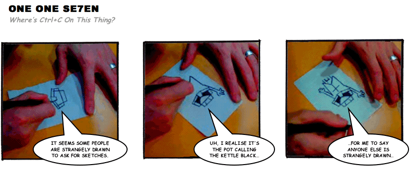 On April 30, 2003, Stuntmutt began turning in episodes of a new comic known as One One Se7en. We'll present them here, in the order in which they were submitted, as they come in. New submissions were added Monday, Wednesday, and Friday. On March 3, 2008, One One Se7en was retired from regular releases - Stunt's life got a tad too busy for 3 strips per week. (He still comes by with new content when the situation arises, however.)