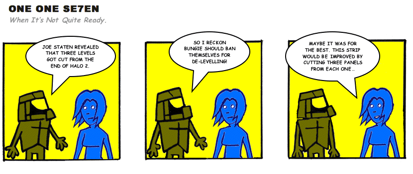 On April 30, 2003, Stuntmutt began turning in episodes of a new comic known as One One Se7en. We'll present them here, in the order in which they were submitted, as they come in. New submissions were added Monday, Wednesday, and Friday. On March 3, 2008, One One Se7en was retired from regular releases - Stunt's life got a tad too busy for 3 strips per week. (He still comes by with new content when the situation arises, however.)