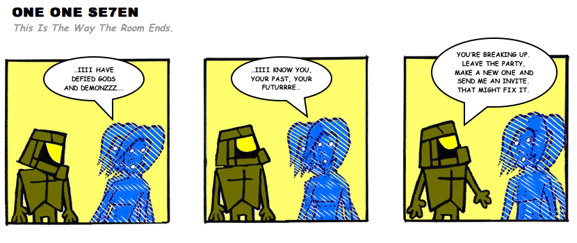 On April 30, 2003, Stuntmutt began turning in episodes of a new comic known as One One Se7en. We'll present them here, in the order in which they were submitted, as they come in. New submissions were added Monday, Wednesday, and Friday. On March 3, 2008, One One Se7en was retired from regular releases - Stunt's life got a tad too busy for 3 strips per week. (He still comes by with new content when the situation arises, however.)