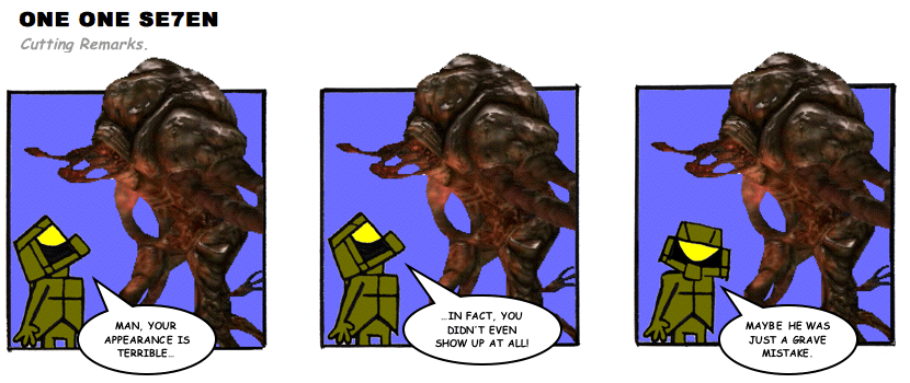 On April 30, 2003, Stuntmutt began turning in episodes of a new comic known as One One Se7en. We'll present them here, in the order in which they were submitted, as they come in. New submissions were added Monday, Wednesday, and Friday. On March 3, 2008, One One Se7en was retired from regular releases - Stunt's life got a tad too busy for 3 strips per week. (He still comes by with new content when the situation arises, however.)