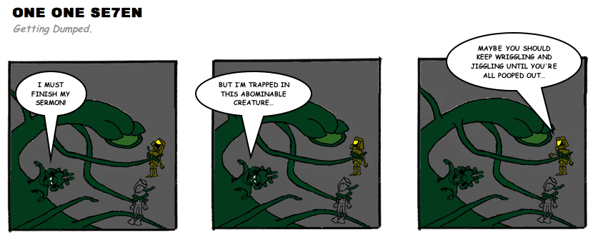 On April 30, 2003, Stuntmutt began turning in episodes of a new comic known as One One Se7en. We'll present them here, in the order in which they were submitted, as they come in. New submissions were added Monday, Wednesday, and Friday. On March 3, 2008, One One Se7en was retired from regular releases - Stunt's life got a tad too busy for 3 strips per week. (He still comes by with new content when the situation arises, however.)