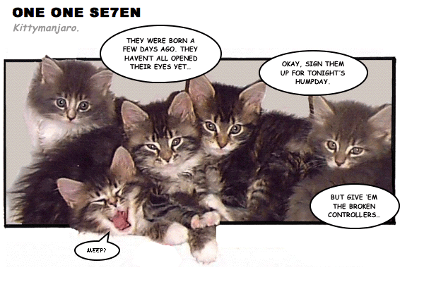 On April 30, 2003, Stuntmutt began turning in episodes of a new comic known as One One Se7en. We'll present them here, in the order in which they were submitted, as they come in. New submissions were added Monday, Wednesday, and Friday. On March 3, 2008, One One Se7en was retired from regular releases - Stunt's life got a tad too busy for 3 strips per week. (He still comes by with new content when the situation arises, however.)