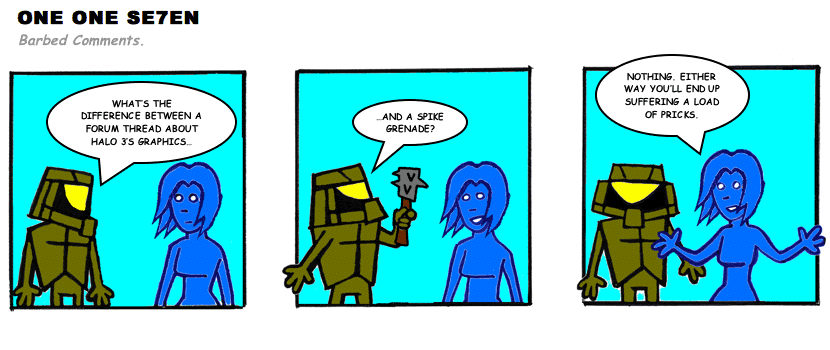 On April 30, 2003, Stuntmutt began turning in episodes of a new comic known as One One Se7en. We'll present them here, in the order in which they were submitted, as they come in. New submissions were added Monday, Wednesday, and Friday. On March 3, 2008, One One Se7en was retired from regular releases - Stunt's life got a tad too busy for 3 strips per week. (He still comes by with new content when the situation arises, however.)