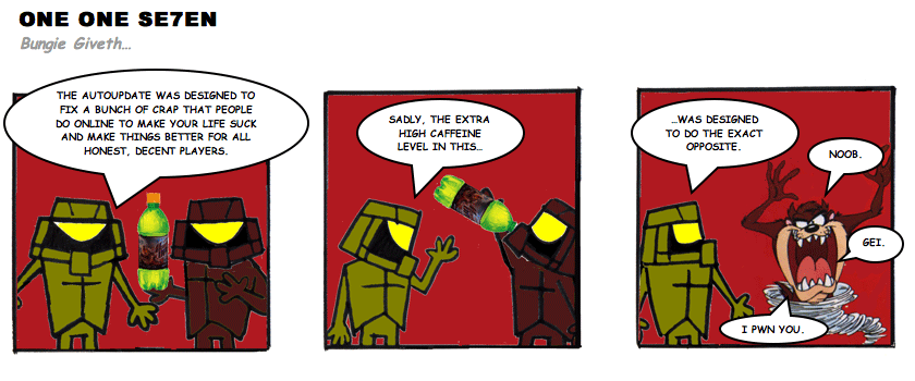 On April 30, 2003, Stuntmutt began turning in episodes of a new comic known as One One Se7en. We'll present them here, in the order in which they were submitted, as they come in. New submissions were added Monday, Wednesday, and Friday. On March 3, 2008, One One Se7en was retired from regular releases - Stunt's life got a tad too busy for 3 strips per week. (He still comes by with new content when the situation arises, however.)