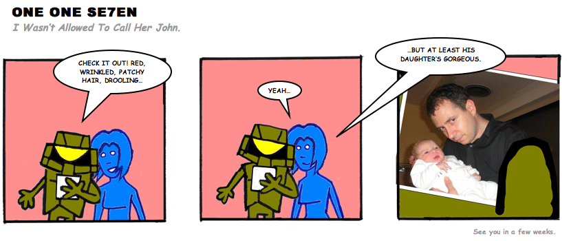 On April 30, 2003, Stuntmutt began turning in episodes of a new comic known as One One Se7en. We'll present them here, in the order in which they were submitted, as they come in. New submissions were added Monday, Wednesday, and Friday. On March 3, 2008, One One Se7en was retired from regular releases - Stunt's life got a tad too busy for 3 strips per week. (He still comes by with new content when the situation arises, however.)
