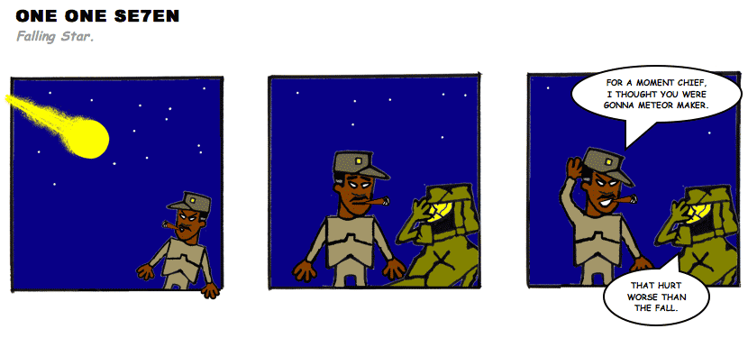 On April 30, 2003, Stuntmutt began turning in episodes of a new comic known as One One Se7en. We'll present them here, in the order in which they were submitted, as they come in. New submissions were added Monday, Wednesday, and Friday. On March 3, 2008, One One Se7en was retired from regular releases - Stunt's life got a tad too busy for 3 strips per week. (He still comes by with new content when the situation arises, however.)